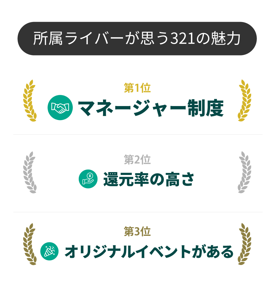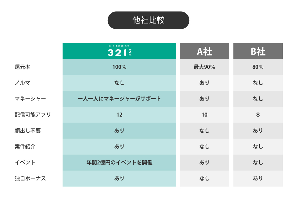 321では、現在、契約しているアプリで配信するライバーさんの、ライブ配信面のみマネジメントを行なっております。ライブ配信以外の芸能案件のご案内や、Instagram等のマネジメントは基本的には行なっておりませんので、ご了承ください。